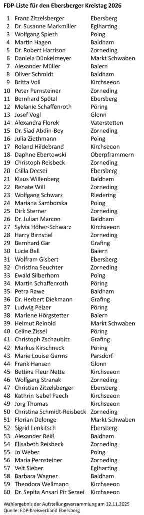 Platz 3 der Liste belegt der langjährige aktive Kommunalpolitiker Wolfgang Spieth aus Poing. Er ist seit 2002 im Gemeinderat von Poing und war schon mal 2010 bis 2014 im Ebersberger Kreisrat. Zudem ist er bereits seit 53 Jahren Mitglied der FDP.