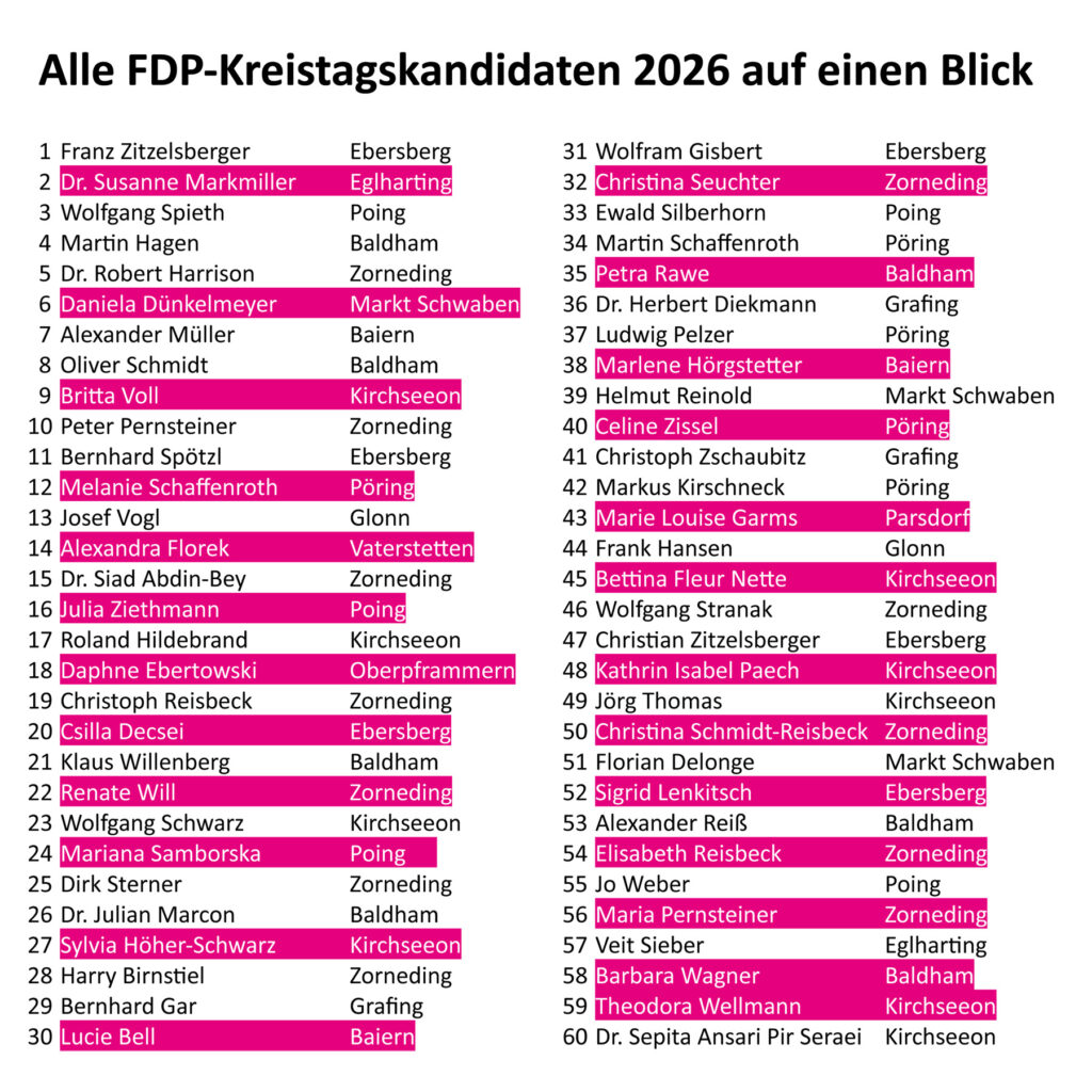 Der FDP-Ortsverband Kirchseeon startet mit einer starken Kandidatin motiviert in den Kommunalwahlkampf 2026. Dr. Susanne Markmiller steht für Pragmatismus, Transparenz und eine lebendige lokale Demokratie. Folgerichtig führt Dr. Markmiller auch die FDP-Liste der zur Wahl stehenden Kandidaten für den Marktgemeinderat an.
