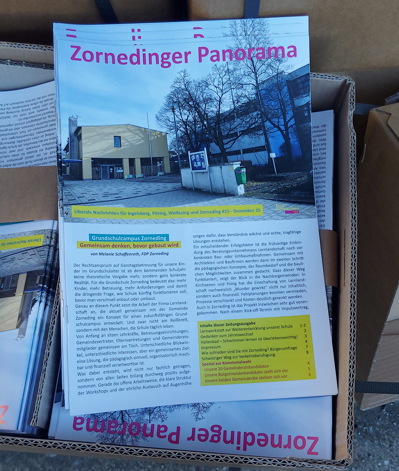 Kurz vor Weihnachten haben wir in Zorneding unsere neue Zeitungsausgabe des „Zornedinger Panorama“ komplett in Eigenleistung verteilt. Wer sie nicht im Briefkasten hatte oder zusätzlich online lesen will, kann sie unter diesem Link als PDF herunter laden.