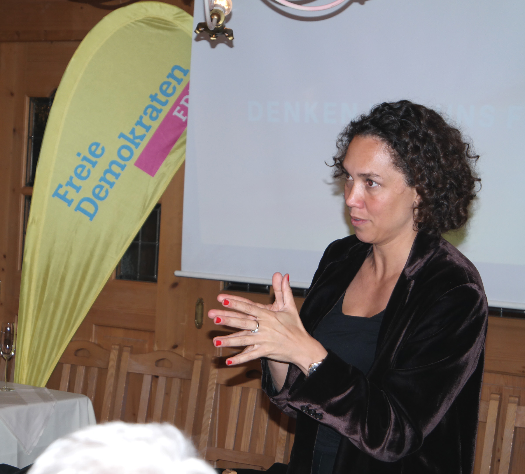 Der Höhepunkt des Abends war der Vortrag der FDP Generalsekretärin Nicole Büttner. Sie ist eine erfolgreiche Gründerin und Unternehmerin im Umfeld von KI Beratung und Entwicklung. Als Mutter von zwei Kindern ist für sie Nachhaltigkeit und Umweltschutz von hoher Bedeutung. Unter dem Motto „Denken wir uns frei“ stellte Büttner die Schwerpunkte des zukünftigen FDP Programms vor.