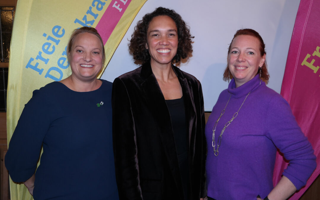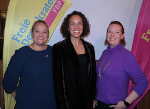 Die FDP-Generalsekretärin Nicole Büttner mit den beiden FDP-Bürgermeisterkandidatinnen Susanne Markmiller aus Kirchseeon (links) und Melanie Schaffenroth aus Zorneding (rechts).