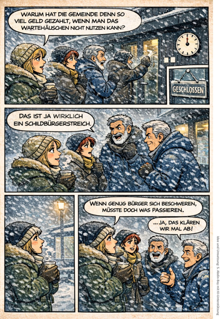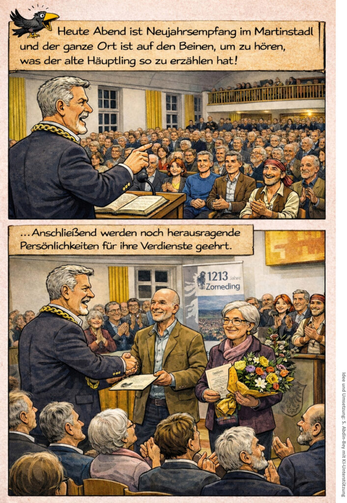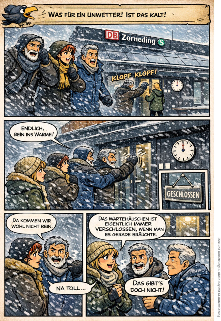 Die FDP Zorneding hat sich mit Hilfe einer KI ein paar Gedanken zur Kommunalwahl 2026 in Form eines Comic gemacht. Er spielt im fiktiven Ort Zorneding. Ähnlichkeiten mit bekannten Personen sind rein zufällig. Unser Comic wird voraussichtlich über den gesamten Zeitraum der Kommunalwahl durch weitere Episoden ergänzt, die hier in diesem Beitrag zukzessiv alle hintereinander folgen. Am Schluss wird voraussichtlich auch der gesamte Comic in Form einer PDF-Datei veröffentlicht, deren Link dann hier zu finden ist.