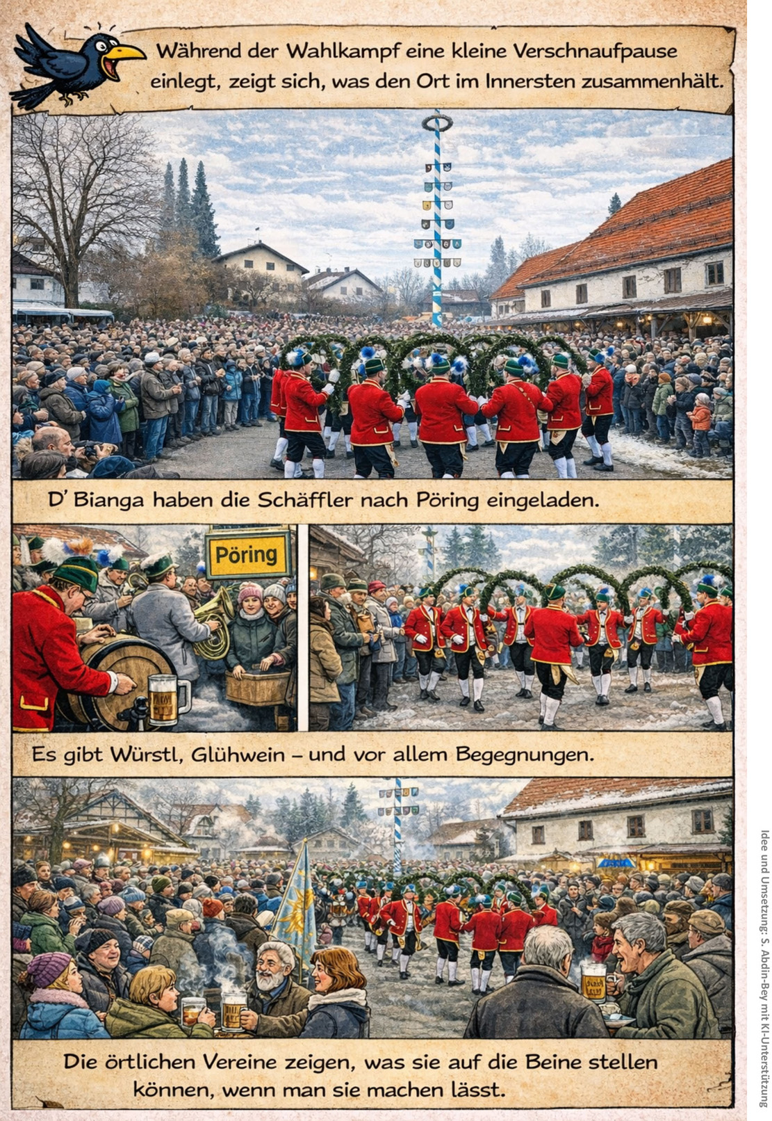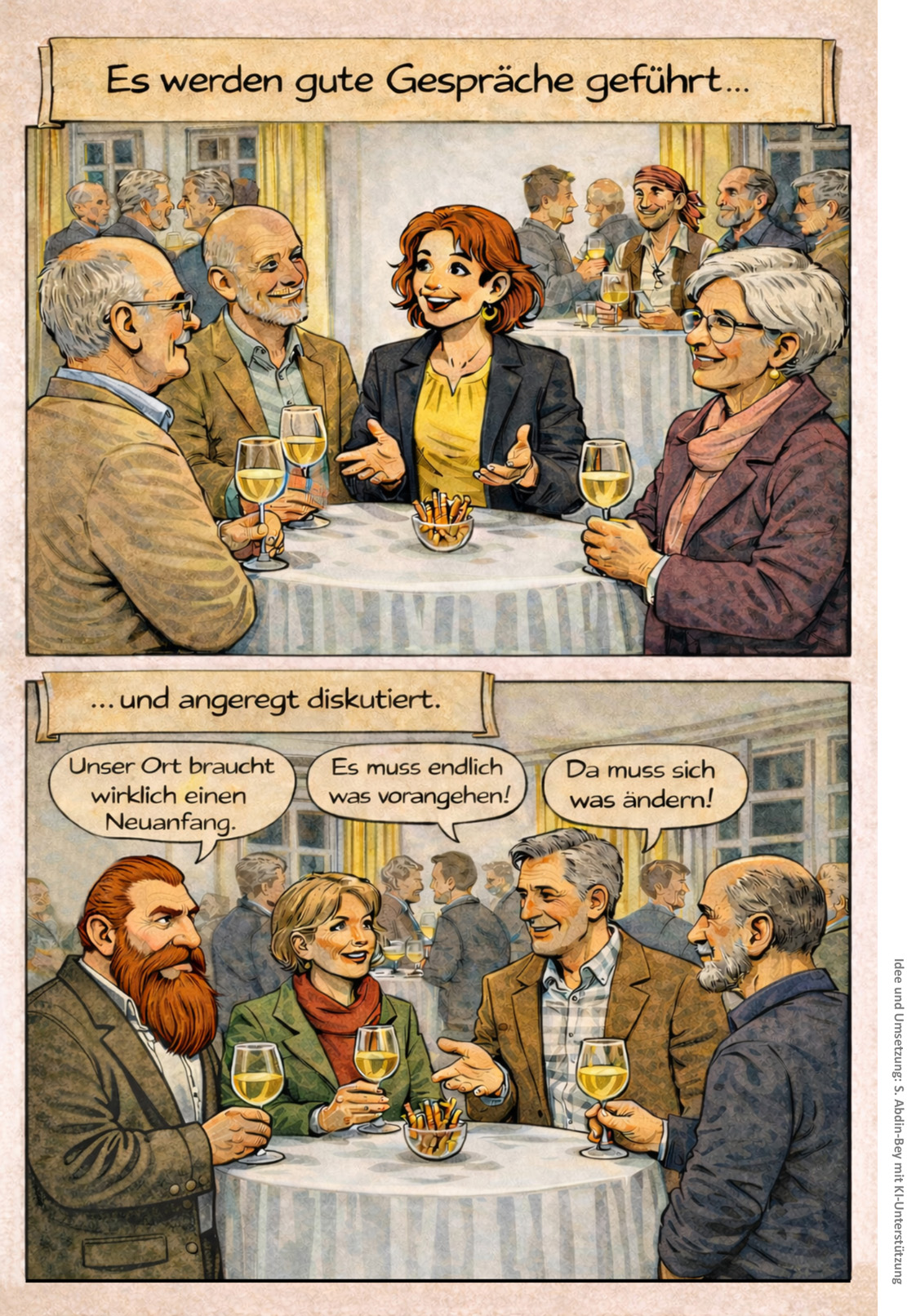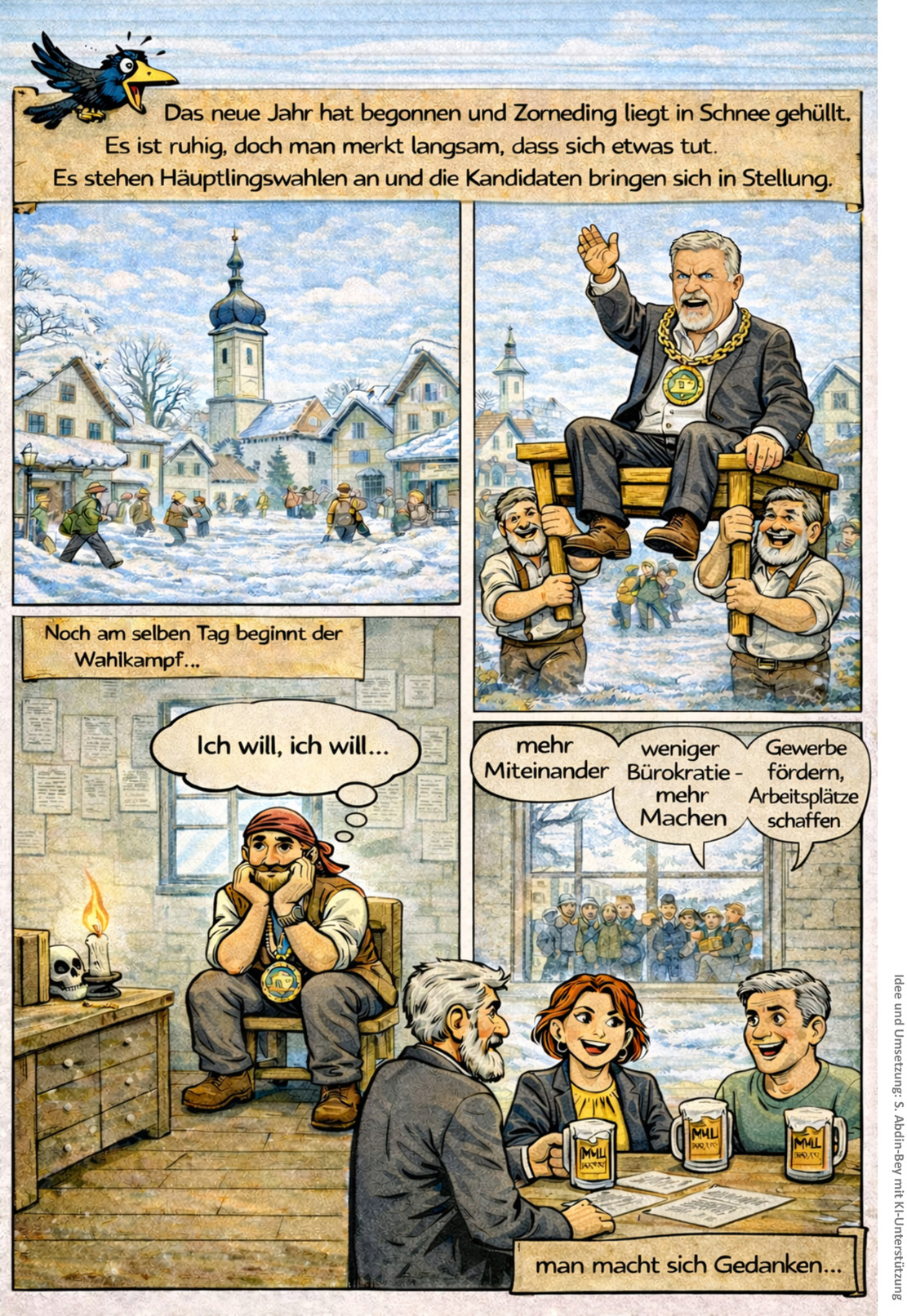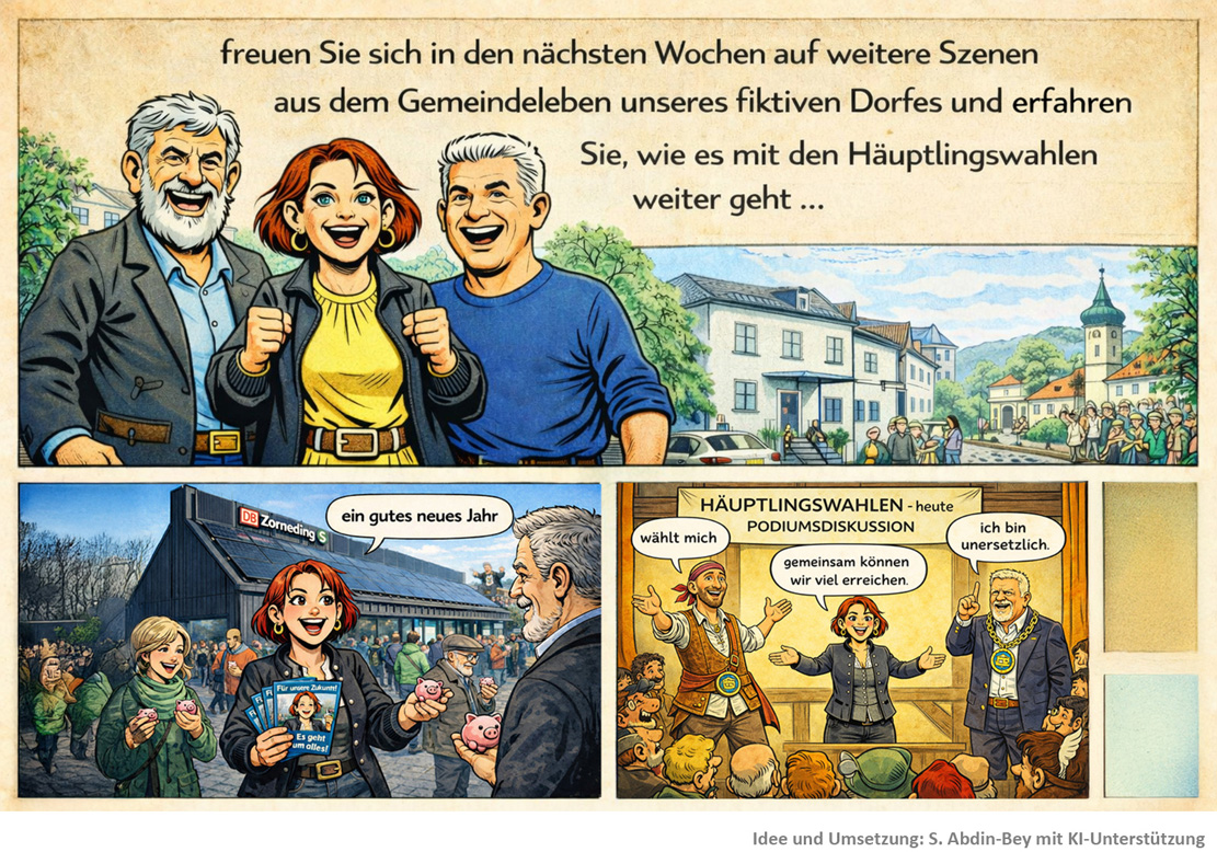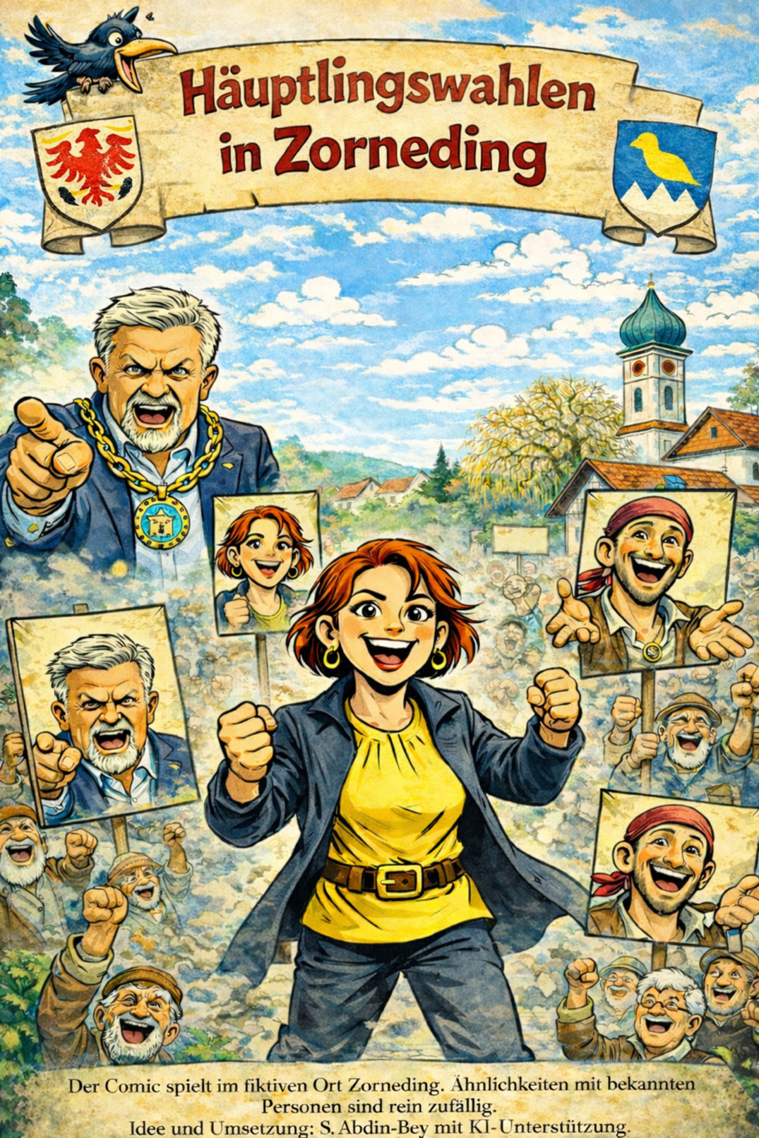 Die FDP Zorneding hat sich mit Hilfe einer KI ein paar Gedanken zur Kommunalwahl 2026 in Form eines Comic gemacht. Er spielt im fiktiven Ort Zorneding. Ähnlichkeiten mit bekannten Personen sind rein zufällig. Unser Comic wird voraussichtlich über den gesamten Zeitraum der Kommunalwahl durch weitere Episoden ergänzt, die hier in diesem Beitrag zukzessiv alle hintereinander folgen. Am Schluss wird voraussichtlich auch der gesamte Comic in Form einer PDF-Datei veröffentlicht, deren Link dann hier zu finden ist.