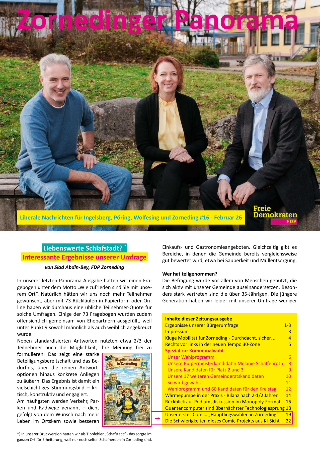In der Zeitung werden alle unsere Kandidaten für den Gemeinderat sowie Melanie Schaffenroth vorgestellt, dei sowohl für den Gemeinderat als auch als Bürgermeisterkandidatin zur Wahl steht. Außerdem ist in der Zeitung auch unser Wahlprogramm zu lesen und zudem gibt es Infos über unsere FDP-Kreistagskandidaten sowie interessante Ergebnisse zu unserer Bürgerumfrage im letzten Panorama und vieles mehr. Schließlich ist auf den letzten Seiten auch etwas Unterhaltung in Form eines Comic geboten, der mit KI-Unterstützung entstanden ist und in den nächsten Wochen noch ein wenig fortgesetzt wird.