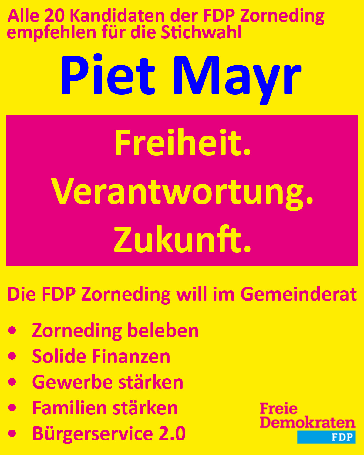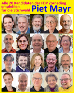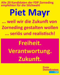 In einer gemeinsamen Abstimmung haben der gesamte FDP-Ortsvorstand und alle weiteren Kandidatinnen und Kandidaten der 20köpfigen FDP-Liste beschlossen, für die Stichwahl um das Bürgermeisteramt Piet Mayr (amtierender Zornedinger Bürgermeister der CSU) zu empfehlen und zu unterstützen. Ausschlaggebend für diese Entscheidung sind vor allem die größeren inhaltlichen Schnittmengen in den Wahlprogrammen und gemeinsamen Vorstellungen für die zukünftige Entwicklung Zornedings. Melanie Schaffenroth betont: „Wir wollen nicht nur das ortsansässige Gewerbe fördern und stärken, sondern brauchen schon lange dringend neue Gewerbeflächen, um die Abwanderung weiterer Firmen zu verhindern und neue Arbeitsplätze zu schaffen. Gleichzeitig müssen wir den Investitionsstau auflösen und für einen seriösen, realistischen Haushalt sorgen. Wir freuen uns auf eine gute und konstruktive Zusammenarbeit mit allen gewählten Gemeinderäten zum Wohle der Gemeinde.“